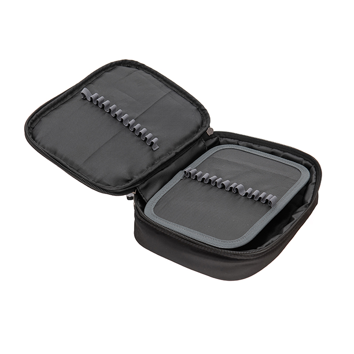 Amplio espacio para útiles con elásticos para lápices y panel móvil